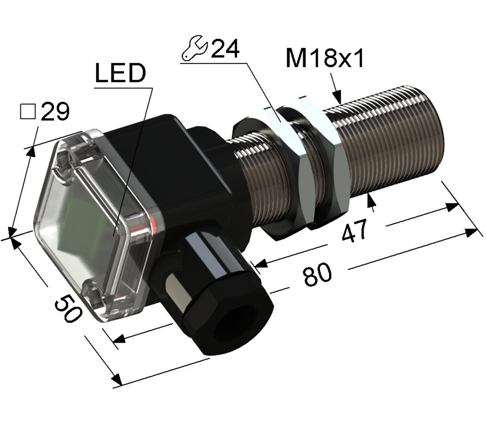 Индуктивный бесконтактный датчик в цилиндрическом латунном корпусе с резьбой М18х1 длиной 80 мм. В комплекте две крепежные гайки.
