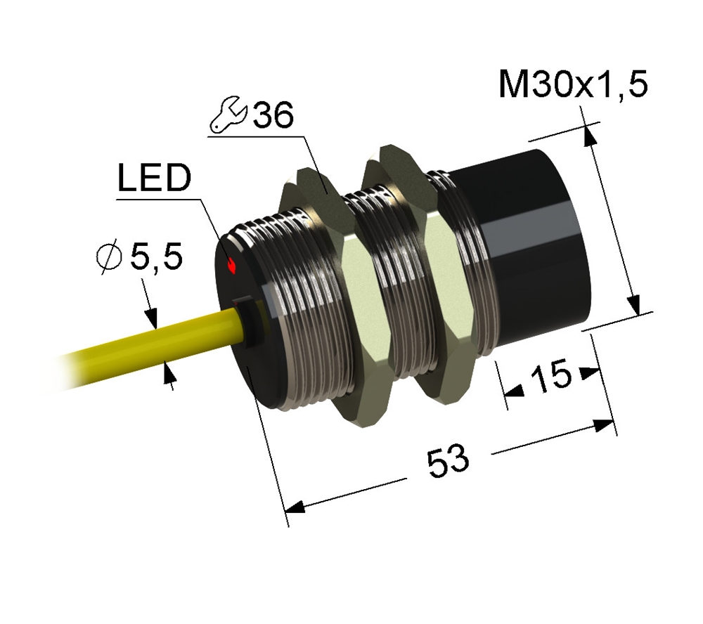 Индуктивный бесконтактный датчик с увеличенным расстоянием срабатывания в цилиндрическом латунном корпусе с резьбой M30x1,5 длиной 53 мм. В комплекте две крепежные гайки.
