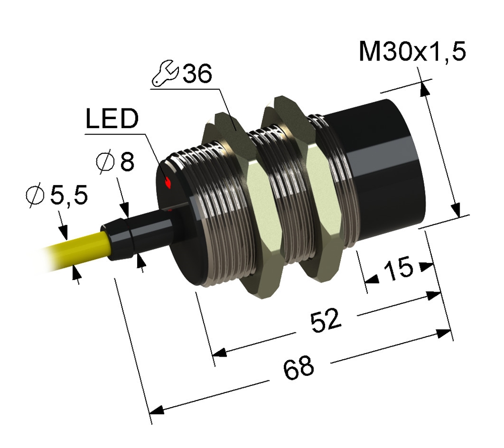 Индуктивный бесконтактный датчик с увеличенным расстоянием срабатывания в цилиндрическом латунном корпусе с резьбой M30x1,5 длиной 68 мм. В комплекте две крепежные гайки.