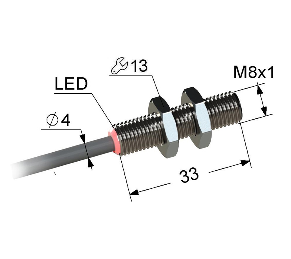 Индуктивный бесконтактный датчик в цилиндрическом латунном корпусе с резьбой М8х1 длиной 33 мм. В комплекте две крепежные гайки.