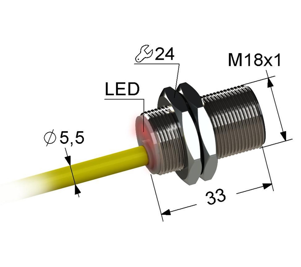 Индуктивный бесконтактный датчик в цилиндрическом латунном корпусе с резьбой М18х1 длиной 33 мм. В комплекте две крепежные гайки.