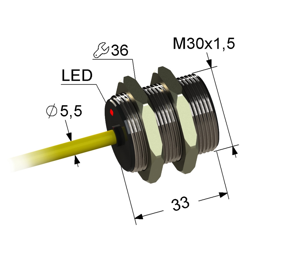 Индуктивный бесконтактный датчик с увеличенным расстоянием срабатывания в цилиндрическом латунном корпусе с резьбой M30x1,5 длиной 33 мм. В комплекте две крепежные гайки.