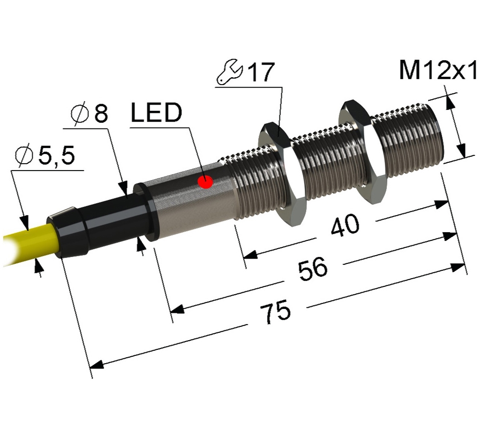 Миниатюрный корпус из пластика АБС и латуни с резьбой М12х1 длиной 75 мм. Может быть настроен на размыкание или замыкание ключа. Тип Т. Барьерный.