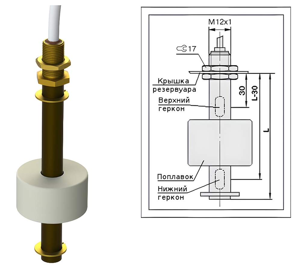 Магниточувствительный датчик уровня предназначен для контроля уровня жидкости. Контролируемый уровень измеряется в положении выключателя кабелем вверх.